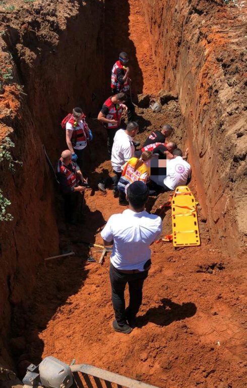 חובש בכיר רכוב על אופנוע כבד של במד״א מנדי חביב* סיפר: ״כשהגעתי למקום ראיתי תעלה רחבה בעומק של כארבעה מטרים, כשעובדים במקום מספרים שערימת חול קרסה על פועל שעמד בפנים. יחד עם העובדים חפרנו בידיים עד להגעה אליו, ובעודו לכוד התחלנו מיד בפעולות החייאה. בסיוע כוחות הכיבוי חילצנו אותו תוך המשך פעולות החייאה, ופינינו אותו כשהוא במצב קריטי לבית החולים אסף הרופא״.