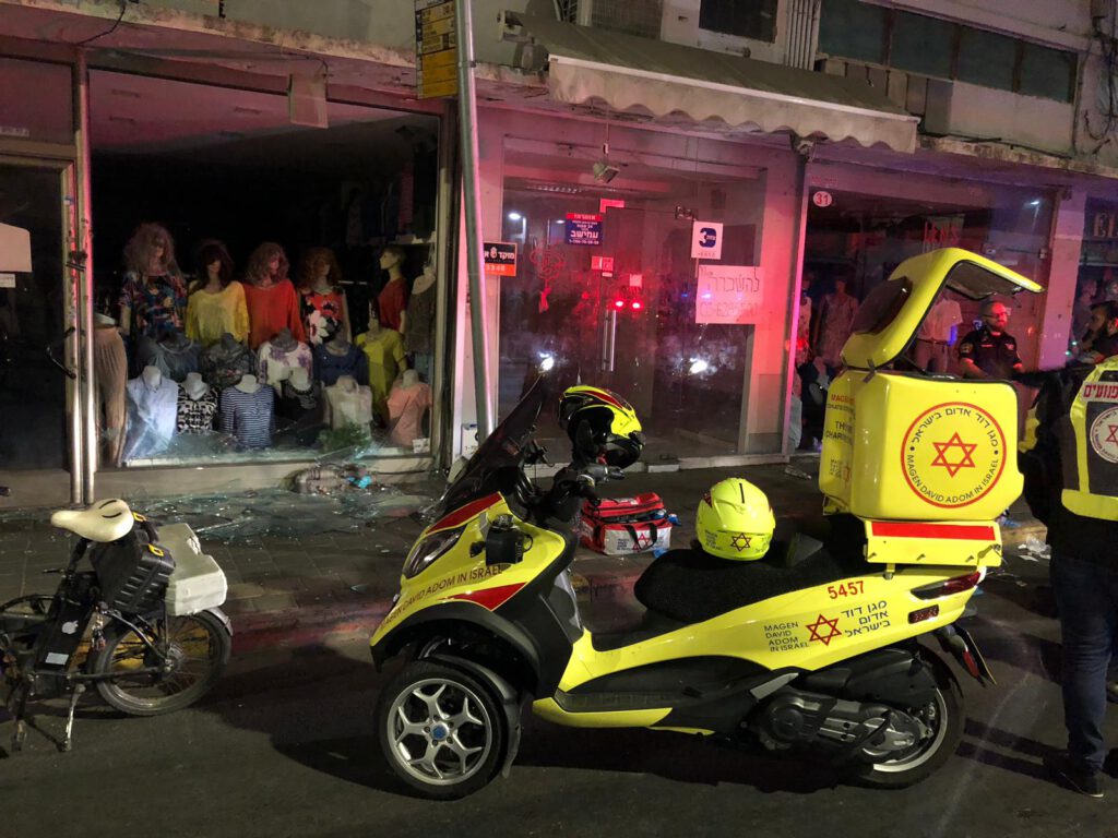 גבר שנפצע מזכוכיות חלון ראווה שהתנפצה ברחוב יפו בתל אביב פונה על ידי חובשים ופראמדיקים של מד"א לבי"ח איכילוב במצב קשה עם חבלות בגפיים.