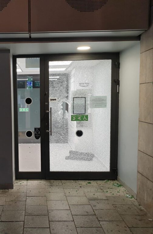 בתוך כך 2 חשודים השליכו אבנים וחפצים לעבר רכוש ובין היתר גרמו נזק וניפצו זכוכית כניסה לבית עסק ברחוב אבן גבירול בת״א.