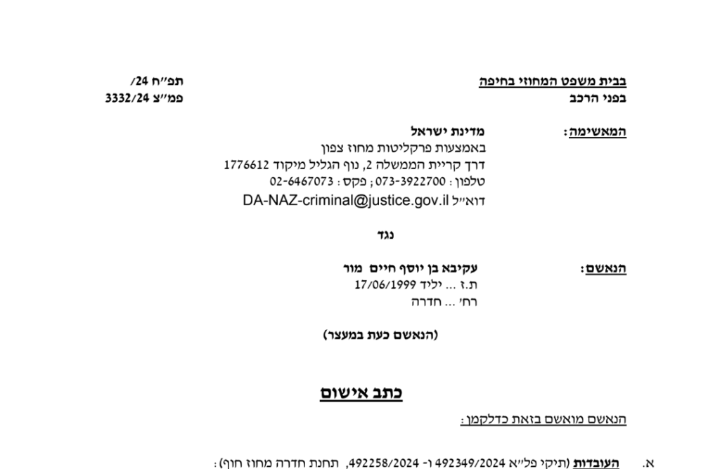 הודעה מטעם הפרקליטות: פרקליטות המדינה הגישה לאחרונה כתב אישום לבית המשפט המחוזי בחיפה נגד עקיבא מור (25) תושב חדרה בגין